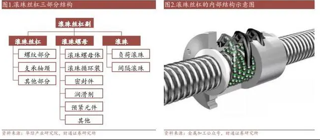 滾珠絲杠,又名滾珠絲杠副,是工業精密機械中常用的傳動元件,其主要結構包括滾珠絲杠、滾珠螺母、滾珠三部分。滾珠絲杠軸為螺母運動的導向軸,其表面具有螺紋,滾珠在螺紋內運動。螺母由預壓片、反向器、防塵器等組成,是直線運動的移動體,帶動滾珠循環機制;其端部密封件用于封裝潤滑零件、防止異物進入。滾珠是利用低摩擦系數維持整個零部件運轉的媒介,存在外循環、內循環兩種循環方式。