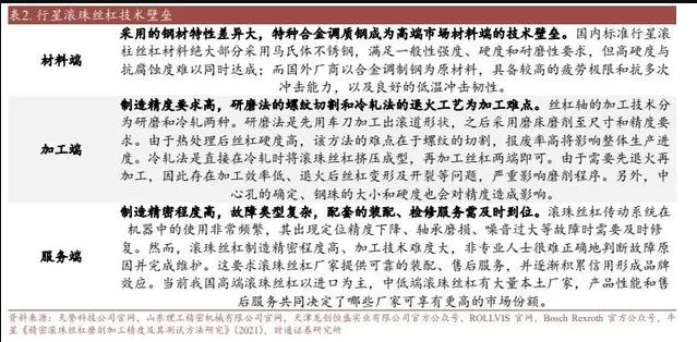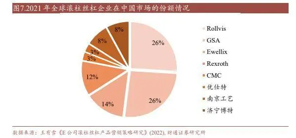 從我國滾動功能部件的市場格局來看,日本、歐洲企業主導高端市場,中國企業仍有進步空間。根據金屬加工公眾號信息,在國內滾動功能部件的高端市場,日本、歐洲企業合計市場份額高達 90%,中國大陸、中國臺灣企業市場份額各約5%,高端市場格局相對集中;在國內滾動功能部件的中低端市場,中國大陸廠商的市場份額約 30%。根據王有雪論文《E 公司滾柱絲杠產品營銷策略研究》論述,2021 年我國行星滾柱絲杠市場供應量排名前四的廠家分別是 Rollvis(瑞士)、GSA(瑞士)、Ewellix(瑞典)Rexroth(德國),市占率分別為 26%、26%、14%,12%。對于行星滾柱絲杠,由于市場較小,行業參與者主要以海外企業為主,主要包括斯凱孚、GSA、伊維萊(Ewellix)、博世力士樂等。