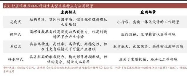 行星滾柱絲杠在標準式基礎上衍生出四種類型,它們在結構和功能上具有不同的特點,從而適用于不同的應用場景。