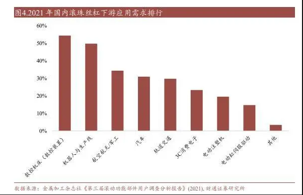 在下游應用場景中,目前國內數控機床、機器人與生產線以及航空航天與軍工為滾珠絲杠最主要應用去向。隨著全球智能化產業鏈的不斷擴張和自動化在各領域的不斷深入,人型機器人、高檔數控機床、電動機械等下游領域有望不斷為包括滾珠絲杠在內的滾動功能部件提供市場增量,從而擴大滾動功能部件的總市場空間。