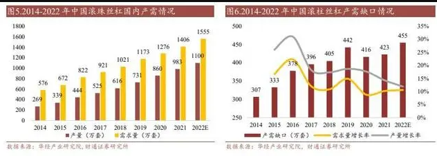 近年來國內滾珠絲杠下游需求穩步增長,產能端加速釋放。根據華經產業研究院數據,我國滾珠絲杠產需量缺口在 2014 年至 2021 年間由 307 萬套上升至 423萬套,預估 2022 年產需缺口為 455 萬套。2014 年至 2021 年產需缺口年均復合增長率約為 4.69%。當前國內滾珠絲杠產量增長速度逐漸趨于放緩,由高速增長逐步轉型為中低速增長,需求量繼續保持增長。未來隨我國高端裝備制造業不斷發展,相關設備的精密傳動需求將不斷加大,對于滾珠絲杠大規模量產能力的要求將進一步提高,或繼續刺激產能釋放。