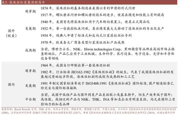 目前日本和歐洲滾珠絲桿企業占據全球約 70%的市場份額,CR5 約占市場份額46%。全球主要滾珠絲杠廠商有日本企業 NSK、THK,德國博世力士樂、舍弗勒等。國內廠商包括中國臺灣的 HIWIN、銀泰等,以及中國大陸的南京工藝、秦川機床(江漢機床)等。國內滾動部件制造廠商眾多,但許多正在研發的企業處于未上市階段,且多數僅具備單件生產能力,和海外大規模量產企業仍有較大差距。